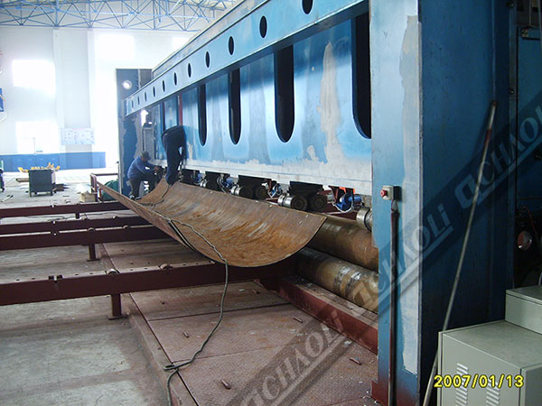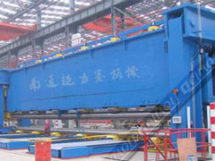 船用三輥對稱式卷板機(jī)結(jié)構(gòu)型式為三輥對稱式,上輥在兩下輥中央對稱位置作垂直升降運(yùn)動,通過液壓缸內(nèi)的液壓油作用于活塞桿而獲得,為液壓傳動;通過特殊設(shè)計(jì)減速機(jī)分別帶動全滾動軸承的兩下輥?zhàn)餍D(zhuǎn)運(yùn)動,為卷制板材提供扭矩;在下輥下部設(shè)有多組托輥,以提高下輥的剛度,并可進(jìn)行垂直調(diào)節(jié);在上輥的上部設(shè)有剛性大梁,在大梁與上輥之間設(shè)有多組托輥,以提高上輥的剛度;適用于超寬圓弧形零件的卷制。可卷板厚3mm-50mm,板寬21000mm的板料。
